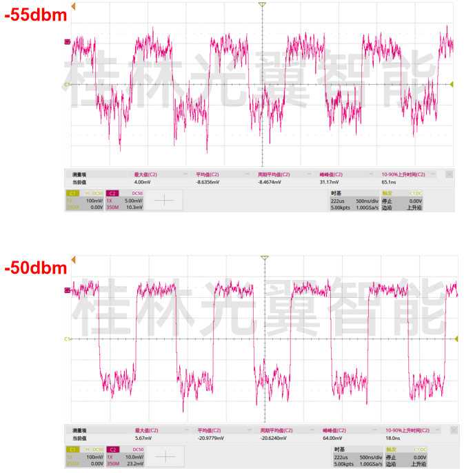 我們測(cè)試1M頻率(1M方波)方案,平均光功率-58dbm,-55dbm,-50dbm,示波器效果如下。