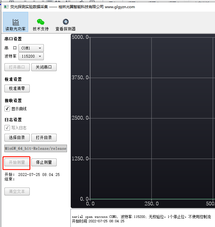 以上步驟準(zhǔn)備就緒,我們就可以開始采集熒光功率數(shù)據(jù)了,在采集軟件上點(diǎn)擊“開始測(cè)量”按鈕,然后在右側(cè)的即可看到當(dāng)前熒光的功率數(shù)據(jù)。